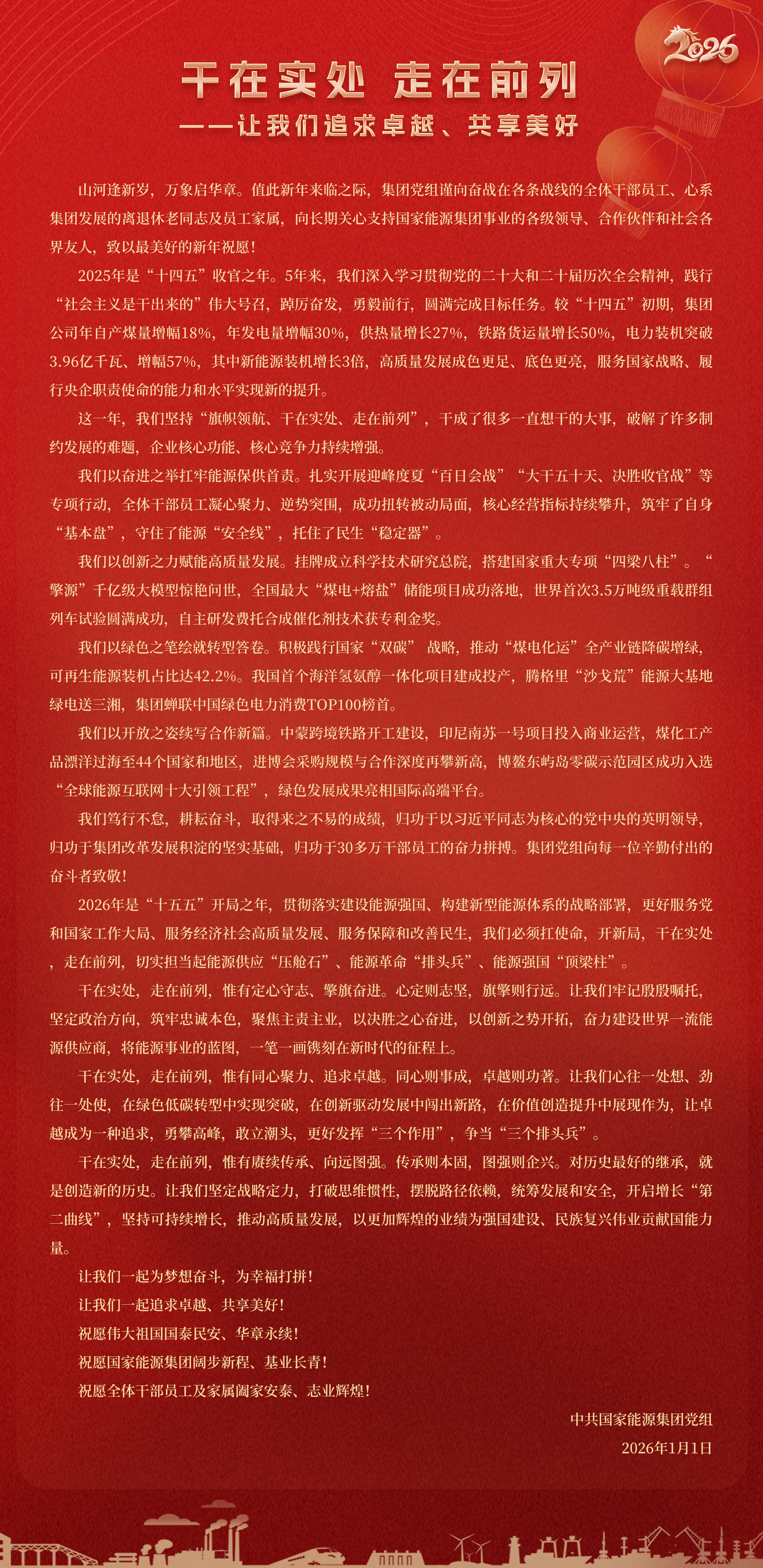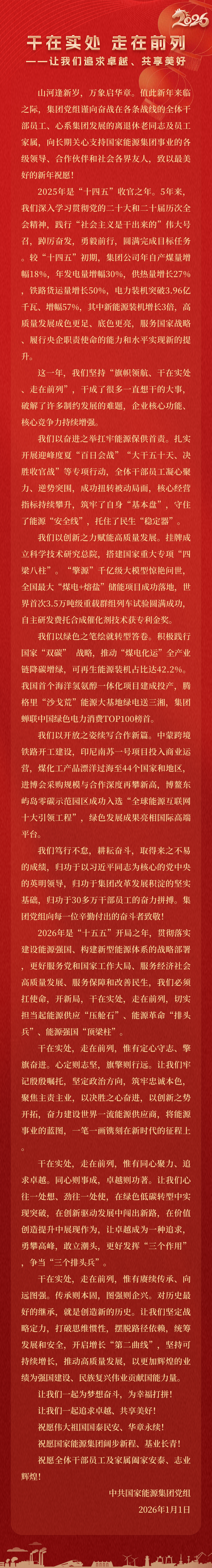 國家能源集團胸懷“國之大者”,增產(chǎn)增供、穩(wěn)價穩(wěn)市,積極服從服務(wù)國家戰(zhàn)略、保障國家能源安全、助力國民經(jīng)濟穩(wěn)增長,推動煤炭安全綠色智能、煤電清潔高效穩(wěn)定、現(xiàn)代煤化工高端多元低碳、運輸物流協(xié)同一體、新能源多元創(chuàng)新規(guī)模化發(fā)展,全力擔當能源強國頂梁柱,能源供應壓艙石,能源革命排頭兵。